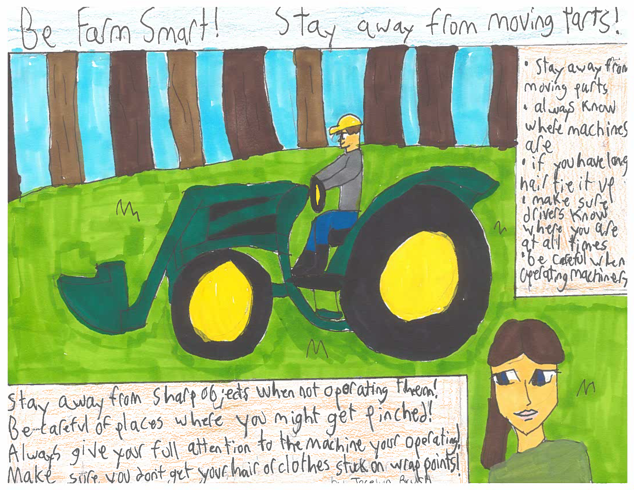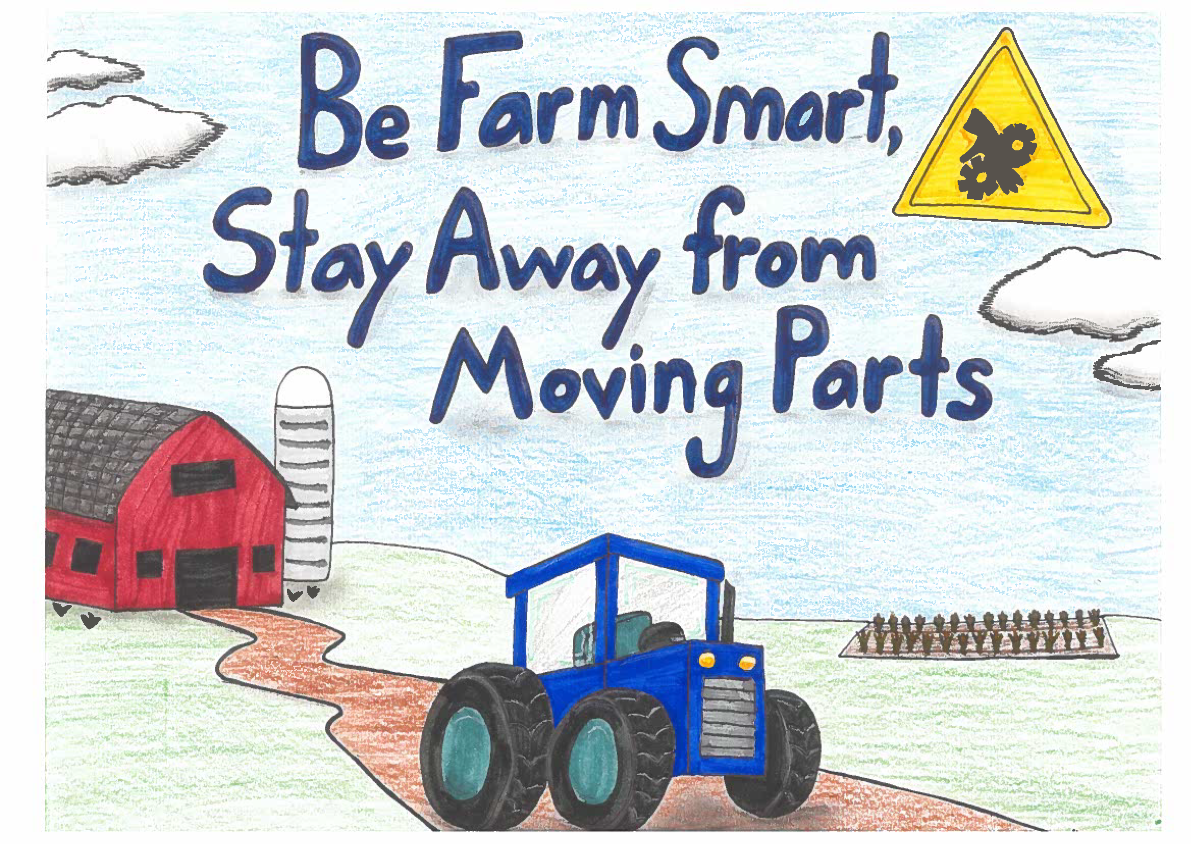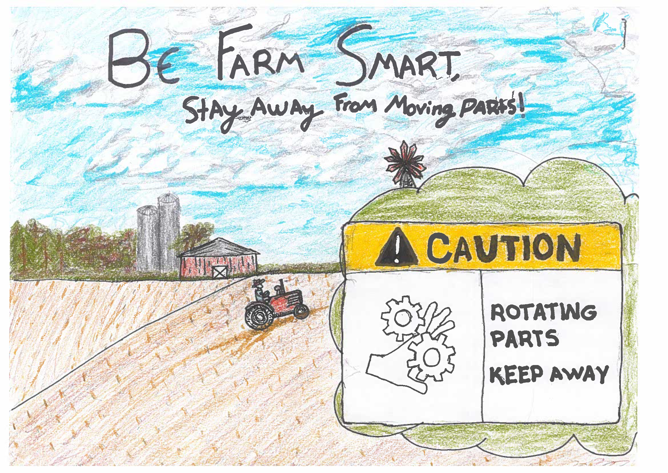 Our 2025 contest garnered 34 entries from youth across the state. Final scores for each entry were based on the relevance of the safety information/content, overall design, and text. Submissions revolved around the theme “Be Farm Smart: Stay Away from Moving Parts,” emphasizing the importance of safe practices around a large array of potential hazards.