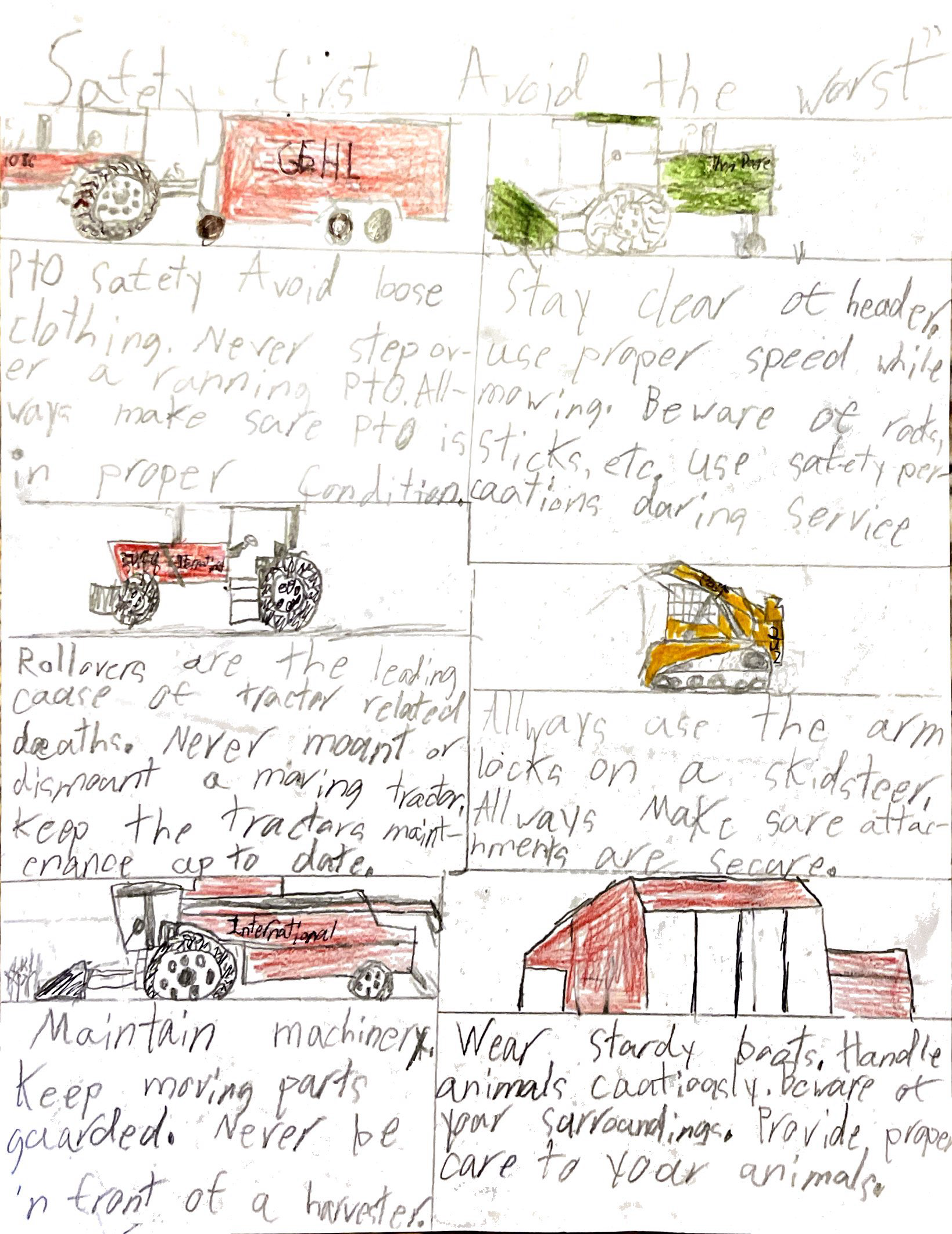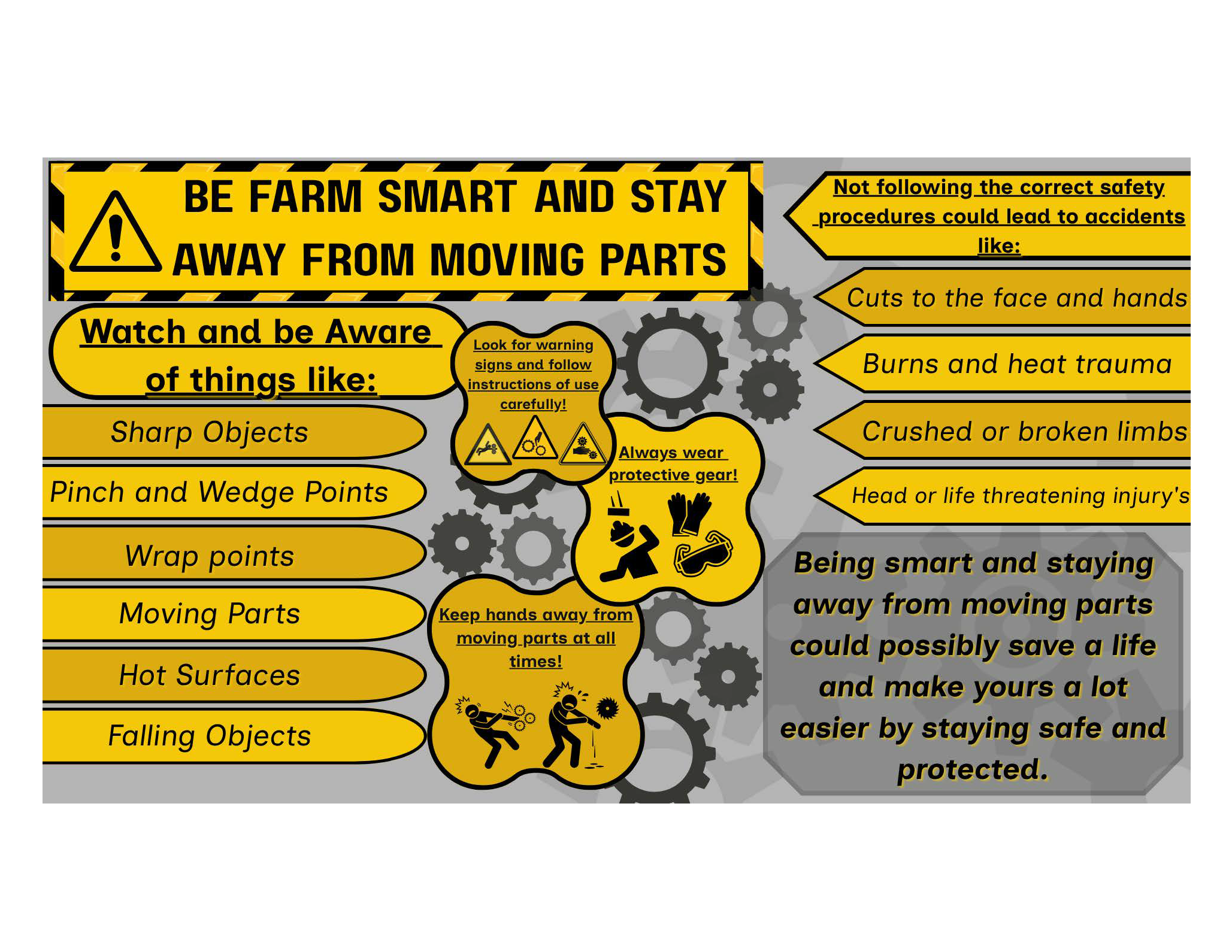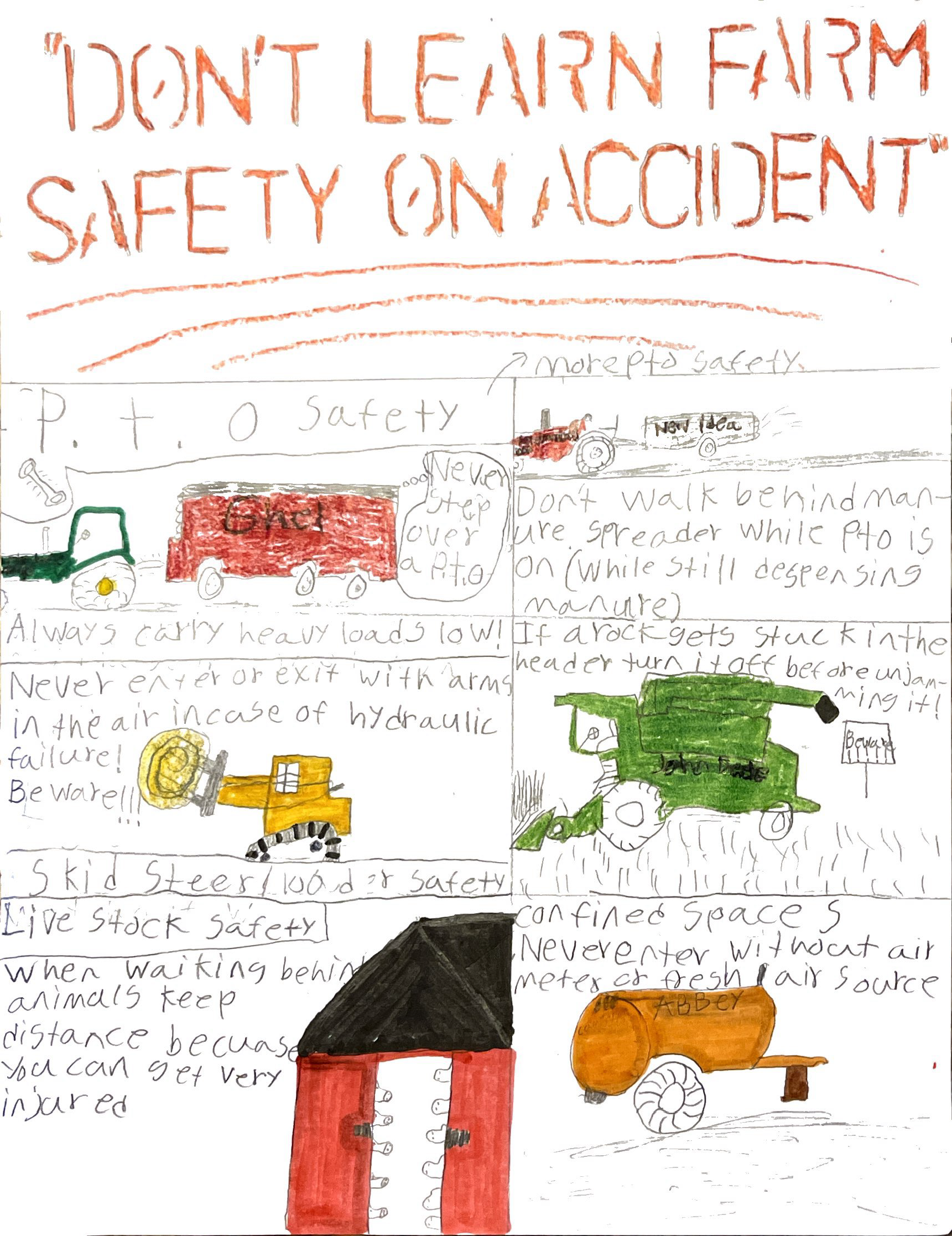 Our 2025 contest garnered 34 entries from youth across the state. Final scores for each entry were based on the relevance of the safety information/content, overall design, and text. Submissions revolved around the theme “Be Farm Smart: Stay Away from Moving Parts,” emphasizing the importance of safe practices around a large array of potential hazards.